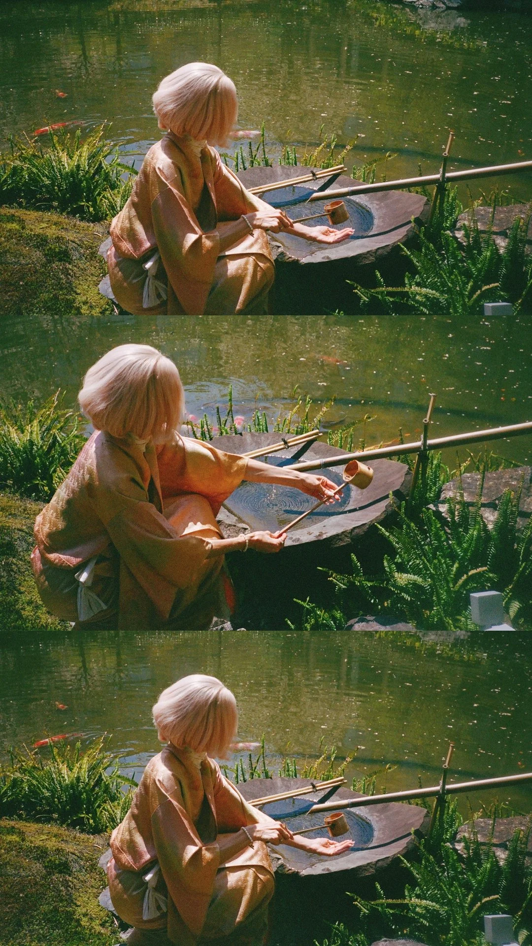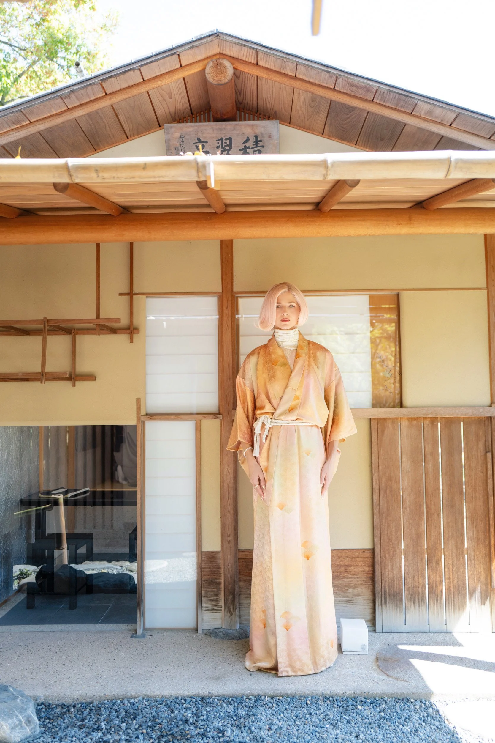 Kyoto Tea Ceremony Jan 21 Written By Samantha Angelo Wearing a vintage kimono found in Tokyo, on top of an Angelilli gown. FashionKezi BanSamantha AngelilliJapanKyotoTea CeremonyTeaDesign by Samantha AngelillimatchaKimonoStylePink HairSpring2024Angelilli Samantha Angelo